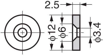 - Through-hole with countersink, hole ⌀3.4 mm (9/64″), countersink 3.4 mm (9/64″)